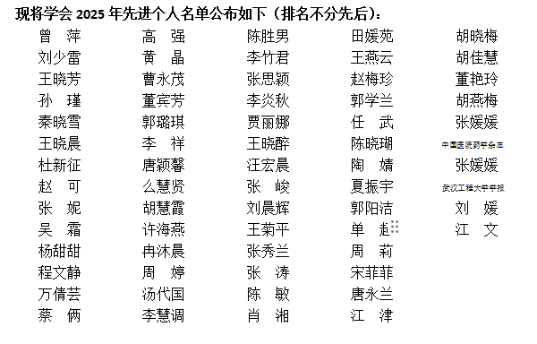 经会员单位申报,由学会秘书处初审,并组织评审专家组复审,学会研究决定,授予曾萍等64名同志为学会“2025年先进个人”。