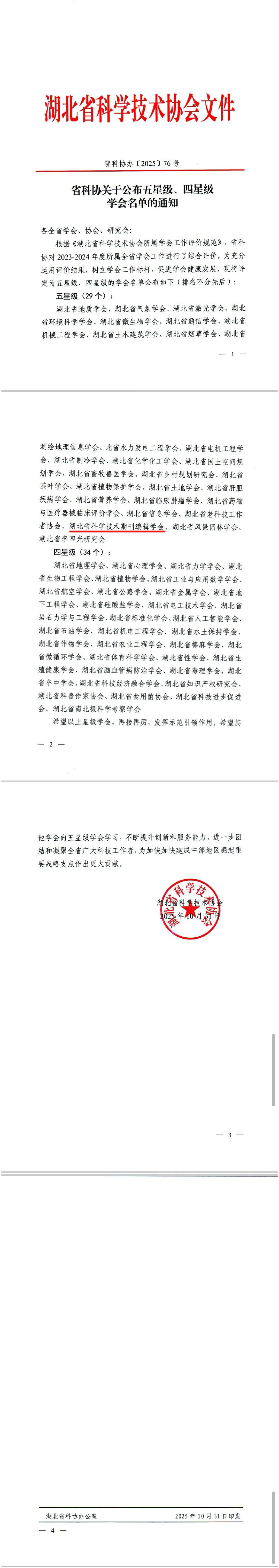 10月31日,湖北省科协公布五星级、四星级学会(2023-2024年度)名单,湖北省科学技术期刊编辑学会(以下简称我会)再次荣获“五星级学会”称号,这是省科协对我会各方面工作的高度认可和肯定。